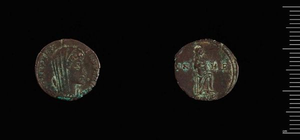 Curator: Let's turn our attention to this fascinating object: a Consecration Coin of Constantine I, struck in Cyzicus. Editor: It feels heavy with history, doesn't it? A miniature monument, etched with faded grandeur. Curator: Absolutely. Notice the careful arrangement of the imagery: on one face, Constantine himself, and on the other, an altar, signifying his deification after death. Editor: The coin's circular form, the figure standing upright, the letters wrapping around—it creates a self-contained world, doesn't it? A complete story. Curator: It does. The medium, in this instance, speaks volumes. The coin's materiality serves not only as currency, but also as a political and religious statement. Editor: So, in its tiny way, this coin is shouting about power and legacy, even now, centuries later. Amazing. Curator: Precisely. It offers a tangible connection to the past and a glimpse into the complex interplay of power, religion, and remembrance. Editor: A small object, big ideas. I find myself oddly moved.