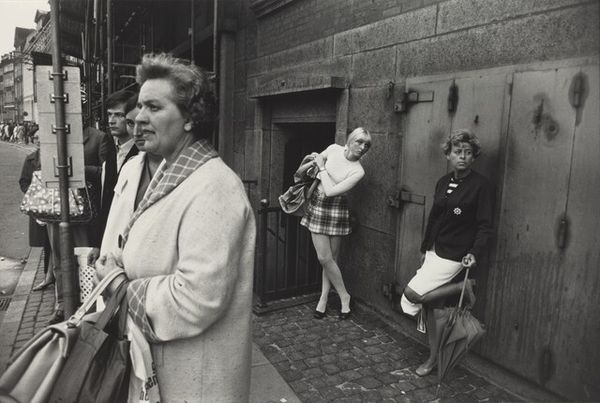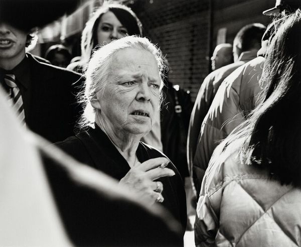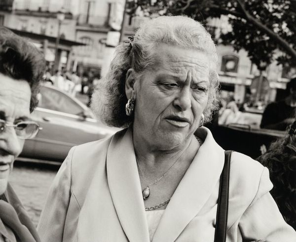 Curator: Looking at this photograph, I'm immediately struck by a sense of apprehension. There's something haunting about it, even. Editor: Well, let’s delve into Leo Rubinfien’s "Madrid, 2004, in the Calle de Velasquez." It’s a black and white photograph, possibly taken sometime between 2004 and 2014, capturing a moment in the bustling streets of Madrid. What contextual elements inform your initial sense? Curator: It's the woman's gaze, isn't it? Directed slightly off to the side and conveying some worry. You know? I wonder what she is seeing and the grayness certainly emphasizes a kind of isolation despite what one expects in a public space. It all combines to create a rather solemn image. Editor: The use of black and white here invites us to consider the legacy of documentary photography, especially its engagement with capturing unvarnished realities. Here we see a moment captured, yet, to what extent is that woman indicative of broader social anxieties? Her attire looks quite smart suggesting an elite, or a former one, which contrasts sharply with a contemporary reading of current socio-economic factors impacting identity in public spaces. Curator: Oh! Very good. Do you think that’s an over-interpretation of such an immediate slice of street photography? Perhaps it might merely document the chance encounter rather than attempt to dissect power and society? I'm leaning towards the simpler take, though yours makes the image resonate quite differently! Editor: Well, street photography often captures unguarded moments. But by the very act of photographing, Rubinfien engages in constructing a narrative. I think there's no reading here which is free of ideological leanings, whether in agreement or not. The context informs our perceptions of everything, including this one solitary portrait, right? Curator: Absolutely. This image has much to say, indeed. The details are all very inviting to that type of analysis. Her clothing, the lighting, the style. There are threads one can keep pulling on, no question about it. Editor: Exactly! I am now wondering what’s going on outside of the frame. Is it worth making up stories of one possible trajectory versus another or better just enjoying the image on its face as presented, but perhaps understanding those lenses one brings with them in every engagement? Curator: Perhaps a healthy balance, eh? Editor: Indeed.