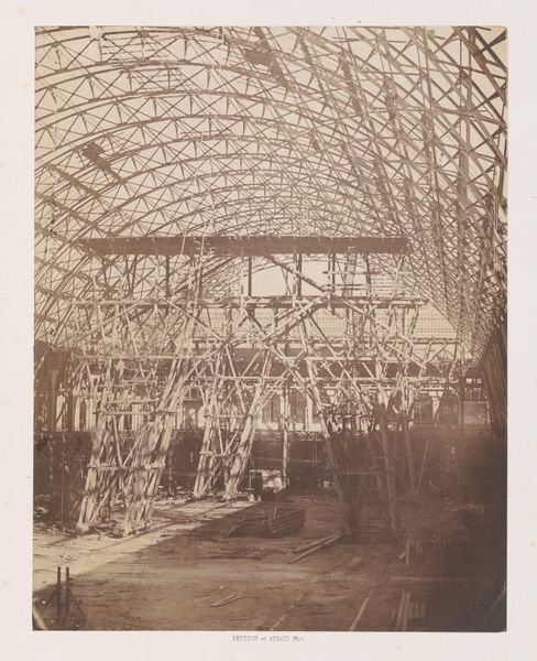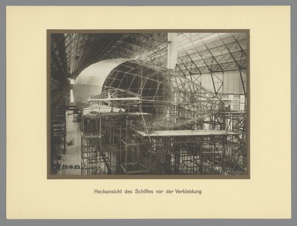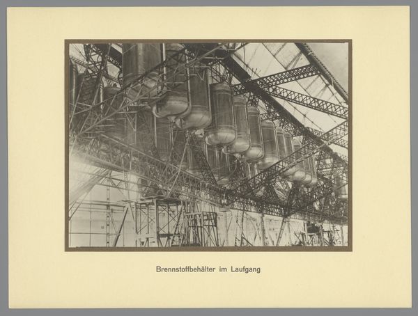 Editor: Here we have a gelatin silver print from 1924 called "Loopbrug binnenin de zeppelin"— which translates to "walkway inside the zeppelin." The photograph offers this dizzying perspective inside what I assume is a zeppelin. The geometric composition really grabs me. What strikes you most about this image? Curator: You know, it's like stepping into a futuristic cathedral, all steel bones and sky. The photographer seems to have captured that fleeting moment where technology flirts with the sublime, doesn't it? It’s a bird’s-eye view—or perhaps a god’s-eye view?—looking down a very narrow, metal path. The eye is almost forced down the "walkway", even if you're not sure what awaits you at the end. Does that strike you at all? Editor: Absolutely. It's both fascinating and a little unsettling. All those converging lines…It almost feels like a construction site, not the interior of a flying machine. It doesn't seem very comfortable. Curator: Indeed, it mirrors the utopian aspirations and the anxieties of the Machine Age. The geometry speaks to a kind of structural truth, but there's an ethereal quality that whispers of vulnerability, no? All of those crossing beams—so rigid but also a bit like a spider's web! Editor: That's a great comparison. So, on one hand, the photograph is celebrating technology and progress. On the other hand, we get this slightly sinister feeling from the sheer scale of it all and those converging lines! I never would have looked at it that way! Curator: That's photography at its best, isn’t it? Freezing a moment and somehow telling a more layered story about space, and our human hopes and fears.