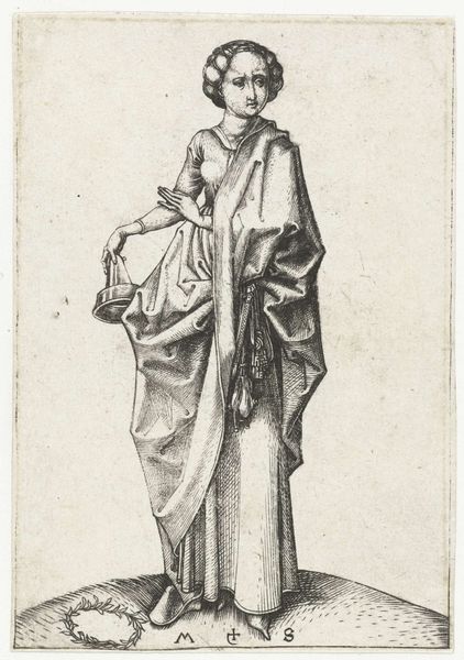Curator: This engraving, created by Martin Schongauer circa 1470-1491, is entitled "The Second Foolish Virgin." It's part of a series, housed right here at the Rijksmuseum. What strikes you immediately? Editor: An austere elegance, certainly. A contained grief perhaps? There’s a solemn weight to her figure, a kind of resignation etched into those precisely rendered lines. The fall of the fabric creates these powerful diagonal vectors across the composition. Curator: Yes, Schongauer had a way with drapery, didn't he? Each fold seems to tell a story of its own. As a leading printmaker of the Northern Renaissance, his skill in engraving allowed for incredible detail and texture. Editor: Precisely. Note the controlled use of hatching and cross-hatching to define the form. Look how Schongauer varies the density and direction of his lines to simulate volume and light across the subject’s body. The material almost appears to breathe! But is there any visual counterpoint here, anything disrupting this mood? Curator: Good question. Notice the extinguished lamp she carries? And the discarded wreath at her feet, a potent symbol of her lost opportunity. She's one of the virgins who failed to bring enough oil for their lamps, missing the bridegroom’s arrival. Talk about high stakes! It does remind me of that time I forgot to charge my phone before giving a lecture – missed so many calls! Editor: Indeed! That sense of unpreparedness underscores the artwork’s message. It’s not merely about divine judgement. Consider this from a structuralist perspective: she becomes an embodiment of belated recognition, highlighting the risks of insufficient foresight. But what do you make of her downcast gaze and almost casual grasp of her robes? Curator: It’s as if the gravity of the situation hasn't fully dawned on her. A touch of nonchalance, or maybe even denial. Which resonates deeply, if I'm being honest! Life is about trade-offs and being in denial occasionally. But ultimately, I see this "Foolish Virgin" as a mirror reflecting humanity’s foibles – a poignant commentary on human nature, frozen in ink. Editor: Beautifully put. And in that reflection, Schongauer's precise lines don’t just depict form; they trace the contours of regret. I'd like to know which other stories can we explore in that precise moment frozen for all time.