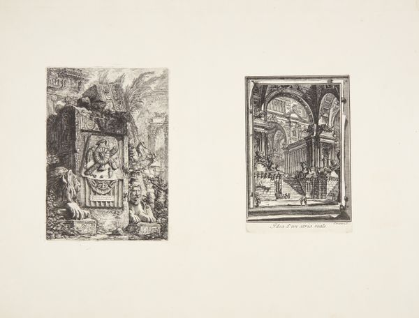 Giovanni Battista Piranesi created this print titled "Idea of the ancient Via Appia and Via Ardeantina / Entrance to an ancient gymnasium" using etching techniques. The composition is divided into two distinct scenes, each densely filled with architectural ruins and figures. The upper scene depicts the ancient Via Appia, a chaotic yet romantic vision of the past. Piranesi uses intricate lines and textures to convey the decay and grandeur of Roman structures. Below, the gymnasium scene employs similar techniques, emphasizing the contrast between light and shadow. The linear perspective guides the viewer's eye through the arched entrance, creating depth and a sense of scale. The arrangement of figures and statues adds a theatrical quality, a signature element of Piranesi’s style. Notice how Piranesi uses the etching to challenge fixed meanings, suggesting a fluid interpretation of history, capturing the sublime collision of past glory and present ruin.