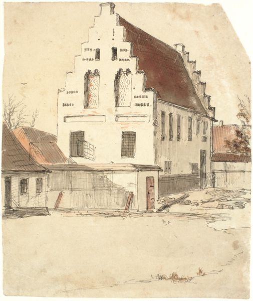 Curator: Well, here we have "Building with Two Figures by a Wall," crafted by Isaac Weissenbruch sometime between 1836 and 1912. It’s an engraving, housed here at the Rijksmuseum. Editor: There's a haunting beauty here, isn't there? Stark shadows, a sort of crumbling grandeur… like a memory fading at the edges. Curator: It does evoke a sense of the past. Weissenbruch was known for his realistic depictions of Dutch cityscapes and landscapes. He captured scenes as they were, without idealizing them. What draws me to it is the contrast between the sturdy architecture and the subtle presence of those two figures. Editor: Exactly! The architecture feels monumental, almost eternal. But then you notice those figures huddling against the wall. Are they seeking shelter? Contemplating the building’s history? They anchor the building to something human and immediate. I wonder about that wall too. Walls always signify division, boundaries… but also protection. This one looks quite fragmented. Curator: Symbolically, I think the wall represents the division between the public and private realms. Weissenbruch invites us to consider how individuals interact with and find their place within the urban environment, don't you think? The figures could be common labourers, deep in discussion about their futures… We can’t be certain about who they are, which leaves plenty of room for imagination. Editor: It also makes me think about cultural memory. Architecture stores our shared experiences. It holds the echoes of lives lived. And even in a state of disrepair, this building emanates authority, like a sentinel watching over those two souls. I love how this simple scene becomes loaded with all this complexity. It truly demonstrates the power of visual narratives. Curator: I find the starkness of the print compliments the feeling of the piece, the high contrast lending a cinematic feel to the everyday street corner. What Weissenbruch managed to do here—and in many of his works—is to remind us that beauty can be found in the most ordinary of scenes. Editor: So true. We are conditioned to believe we need great heroes and heroines to make art interesting, but sometimes the humble interactions between person, place and time produce just as powerful insights.