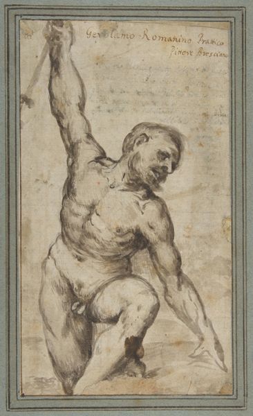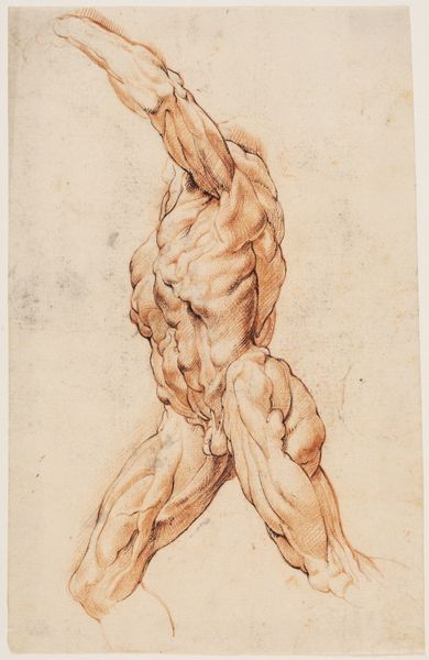 This red chalk drawing of a Standing Nude Man by Taddeo Zuccaro was created in the 16th century. Zuccaro, an Italian painter of the Renaissance, reflects the artistic conventions of his time, particularly in his study of the male nude. The drawing presents a muscular male figure, rendered with careful attention to anatomy. The pose is dynamic, suggesting movement and strength. Given Zuccaro's historical context, it's important to consider how ideals of masculinity were shaped by the societal values. The male nude in Renaissance art was often used to convey notions of heroism. Zuccaro would have been expected to adhere to traditional representations but the artist's choice to focus on the human form allowed for a degree of individual expression, capturing the emotional impact of the figure. Consider how the drawing invites us to reflect on the construction of gender, power, and identity in the context of the Renaissance.