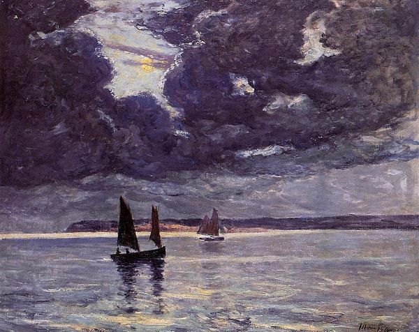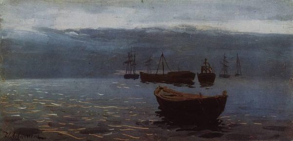 Curator: Edward Henry Potthast’s painting, titled "Along the Mystic River," presents a captivating waterside scene. What are your initial thoughts on this work? Editor: The muted colors, especially the interplay of lavenders and golds, give it a very calm, contemplative feel. It reminds me of those quiet moments at twilight. Curator: Absolutely. Potthast masterfully employs the principles of Impressionism, capturing the fleeting effects of light on the water's surface. Notice the broken brushstrokes—short, separate dashes of color—that coalesce to create shimmering reflections. The formal structure depends largely on these ephemeral gestures. Editor: Right, and I'm thinking about how Potthast might have created this outdoors, en plein air. The materiality is palpable. You can almost feel the weight of the oil paint on the canvas, mirroring the textures of the docks and boats themselves, places where the real work happens. Curator: Good point. There's a spatial ambiguity here. While there's a clear foreground and background, Potthast uses aerial perspective and tone to compress the space, emphasizing the overall unity of the scene. It invites closer inspection. Editor: It's interesting to consider the historical context too. The Mystic River area was heavily industrialized around that time. Even if we don’t know when exactly the piece was created, what about this depiction captures or omits from the labor on that waterfront? Curator: I see what you mean; instead of industrial imagery, we're offered a tranquil view. Yet even the absence of that narrative reveals a lot, perhaps suggesting the artist's intent to depict a serene retreat from urban life rather than its gritty realities. Editor: So the very absence becomes a powerful statement, consciously choosing what to represent and, crucially, what to leave unseen. I hadn't thought about it that way. Curator: Exactly. Art is a language of presence, but equally of absence. This brief exploration reveals new dimensions, offering nuanced insights beyond the surface. Editor: I agree, diving into the materiality, we unearth connections to the lived experiences of labor and nature—enriching how we perceive not just this painting, but art as a product deeply interwoven with our histories.