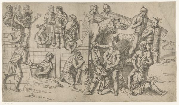 Andrea Mantegna created this engraving, *The Entombment of Christ*, likely in the late 15th century, now at the Metropolitan Museum of Art. The scene is rendered with a dramatic intensity, achieved through meticulous lines and a composition that guides our eye through layers of grief and solemnity. Notice how Mantegna employs a complex arrangement of figures, each etched with nuanced emotion, against a stark, almost theatrical landscape. The figures are carefully composed, guiding our gaze from the body of Christ towards the sorrowful mourners and up to the crosses on the distant hill. This spatial organization invites a reading that intertwines human suffering with divine tragedy. The medium itself enhances the thematic content, the stark lines and tonal contrasts contributing to a sense of stark reality. It is in these formal choices that Mantegna opens up avenues for interpreting the artwork, inviting a deeper engagement with the themes of sacrifice, loss, and the very human response to the divine.
