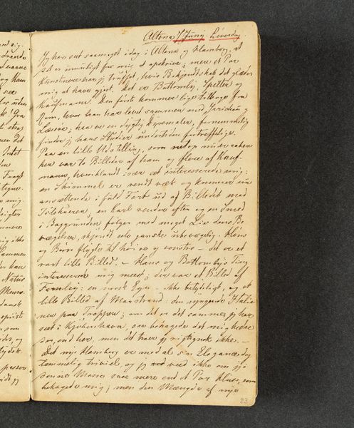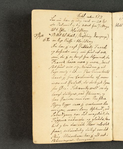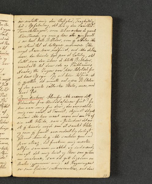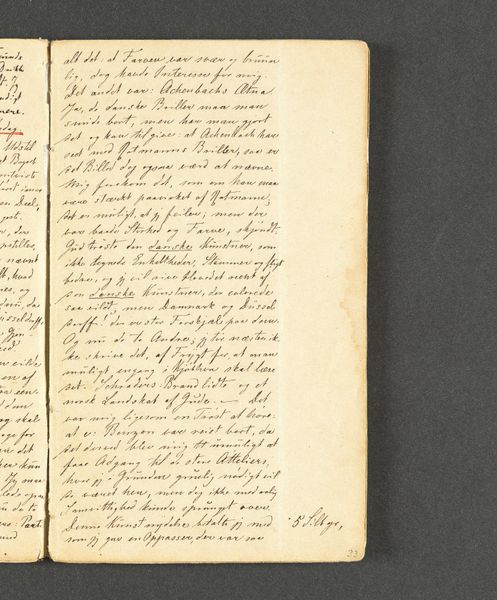 Curator: Today we’ll be discussing "Rejsedagbog," or "Travel Diary," by Johan Thomas Lundbye, created around 1845. This piece, housed at the SMK - Statens Museum for Kunst, is executed in ink on paper. Editor: My immediate impression is of dense script, lines of ink forming a visual tapestry. It feels both intimate and imposing; almost claustrophobic but with a compelling sense of texture. Curator: As the title suggests, this work offers us a peek into Lundbye's personal observations and experiences during his travels. He was a key figure in Danish Golden Age painting. The diary itself is more than just a travel log; it is a repository of thoughts, sketches, and reflections that shed light on the period's cultural and intellectual landscape. The Romantic era emphasis on emotion and nature is central. Editor: While the historical context is invaluable, the materiality speaks volumes too. The way the ink bleeds slightly into the paper, the variations in line weight, almost creates a relief, a certain cadence of text; it’s not just informational but evocative, stirring the same sentiments perhaps Lundbye experienced. Curator: Absolutely. His use of language becomes a tool to record not just what he sees, but how he feels, contributing to a broader narrative around nationalism, identity, and place during a pivotal moment in Danish history. The travel diary becomes a powerful artifact documenting cultural shifts. Editor: For me, beyond the narrative, it’s about pure abstraction here – a visual feast for the eye through dense, scribbled form, a texture almost challenging legibility in exchange for aesthetic rapture. A visual score to which you can ascribe what feelings you want. Curator: That friction, between legibility and abstraction, is crucial to this artwork’s power. It’s an intersection between text and image, the personal and the historical, offering a nuanced understanding of Lundbye. Editor: Seeing this diary through both perspectives has been an intriguing juxtaposition, bridging its tactile form to its historic world.