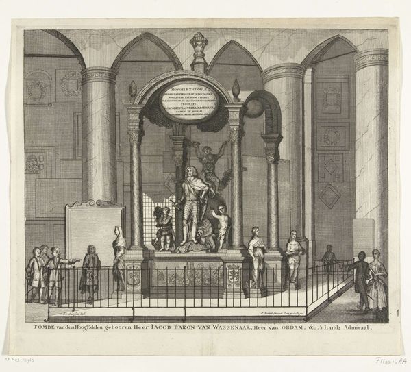 Curator: Oh, how stark and imposing! There’s something deeply mournful about it, even before you start to pick it apart. Editor: Indeed. What we have here is an engraving entitled "Mausoleum," created before 1800. The artist, whose name has sadly been lost to history, captured an elaborate tomb, and the Rijksmuseum is where this particular print resides. It’s interesting to note the materials depicted: marble, primarily, given the architectural structure and the sculpted figures. Curator: Lost to history...a phrase that perfectly suits this image, doesn't it? I feel a powerful sense of loss radiating from the cool precision of the lines, like echoes in an empty cathedral. The artist must have had such technical prowess to give this piece the illusion of cold marble. Editor: Absolutely. It is technically impressive, demonstrating the skill of engraving to render a grand architectural space. I think it speaks to the social importance of memorializing power and status through architecture and art during that time. Mausoleums like these were not just places of burial but potent symbols of lineage and legacy. Curator: Symbols, yes, but I am sensing a strange melancholy behind all of the grand architecture and statuary...Look at the way those drapes hang over the sarcophagus; it looks less like a proud display and more like someone in grief shielding themself from the outside world. Editor: That's a compelling observation. Considering that artistic patronage often came from the elite, images like this served specific functions – public pronouncements, essentially. Did they always reflect private emotions? Perhaps not always honestly. The politics of representation played a massive role in image creation. Curator: So much art from this period feels like it tries too hard. It’s fascinating to find glimmers of, dare I say, vulnerability peeking through. This print has really wormed its way into my subconscious, prompting a somber thoughtfulness. Editor: Mine too. In viewing pieces such as this engraving, one realizes art truly serves as a timeless conversation across eras.
