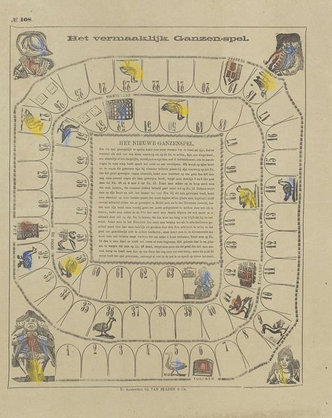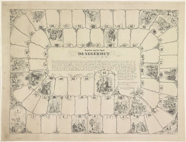 Curator: Here we have an engraving from 1858, titled "Ganzenspel," housed in the Rijksmuseum. It's an anonymous work, depicting what appears to be a board game. Editor: It reminds me of old family game nights. This circular layout, with the charming albeit rudimentary figures scattered along its path—it evokes a quaint nostalgia, doesn’t it? But I immediately zoom in on the materials and processes used to make it: how the printing matrix would have been made and manipulated in the copper, the labour that all of it requires. Curator: Absolutely. "Ganzenspel," which translates to "Game of the Goose," was an incredibly popular game dating back centuries, and was meant to be enjoyed and accessible across gender, race and age groups, but these kinds of illustrations offer insight into the broader social contexts of that entertainment, no? Consider the potential gender roles displayed here, if any. Editor: Indeed. We can speculate, or start to investigate whether printed games like this were broadly made available, to different echelons of Dutch society for instance? The graphic quality implies a specific consumer. Curator: And consider the specific details within each numbered space. There's a well, a tavern, various figures engaged in everyday activities. These wouldn't merely be arbitrary; each symbol resonates with certain shared meanings and assumptions, and the entire illustration is deeply steeped in folklore and popular culture from the period. Editor: So you think we could learn much from these scenes if we approached each square as some symbolic gesture? I mean, look at the composition and its physical qualities. The inking quality isn’t sharp: do we see then this being more broadly distributed, mass-produced perhaps, reaching broader sections of society in doing so? Curator: Perhaps! What I think this print exemplifies best is how cultural pastimes, seemingly trivial, acted as social markers and are deeply intertwined with the period’s belief systems. It opens to ask broader questions on social strata, how it played a role in domestic and personal life. Editor: I find myself increasingly drawn to its materiality now. What papers would be used for such purposes at the time, what methods were most efficient for mass production? "Ganzenspel" truly brings forward a window of analysis into materials of everyday leisure in the 19th century!