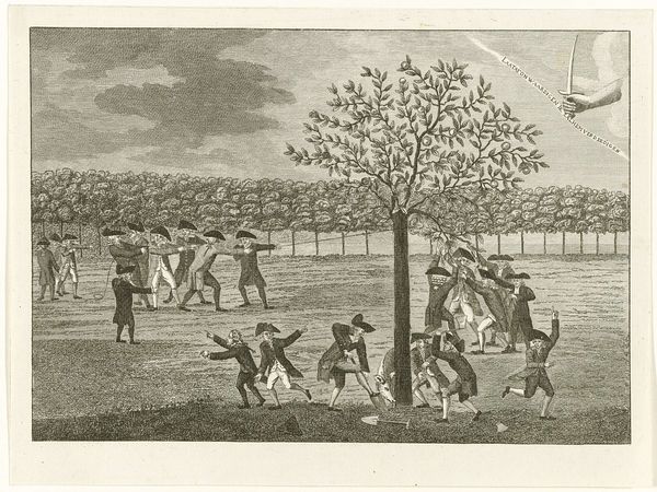 Curator: Here we have "The Boston Common," designed by Winslow Homer. Look at the detail in this print! Editor: It evokes a real sense of leisure, almost a ritualistic promenade. The light, dappled effect from the trees softens the starkness of the line work. Curator: Absolutely. The image, published in Harper's Weekly, reflects a specific moment in time. It speaks of social order, perhaps even a carefully constructed reality. The attire, the activities, all carry societal weight. Editor: The hatching and cross-hatching are so effective. The forms, though simple, create depth and texture. See how the artist uses shadow to suggest the volume of the figures and the density of the foliage? Curator: The hat on the ground, though a small detail, might symbolize a disruption, or perhaps the casualness of the scene despite the formality. Consider the park as a stage for social performance. Editor: I see the careful construction, the balance of light and dark. It's a study in contrasts, both visual and perhaps social. Curator: Indeed. It's a reminder of how images shape and reflect our understanding of the past. Editor: A wonderful example of how technique can elevate the ordinary.