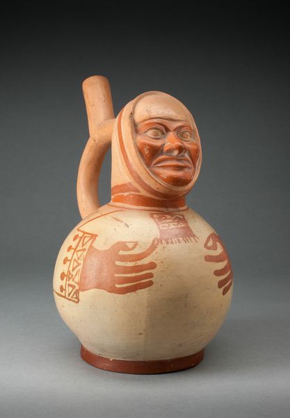 Curator: This is a striking ceramic piece made by the Moche people sometime between 100 and 500 AD, titled "Handle Spout Vessel in the Form of a Seated Man Carrying a Bag". You can find it here at the Art Institute of Chicago. Editor: My initial thought? It's wonderfully expressive! A little whimsical even. The earthy tones give it a warm, approachable vibe. I imagine holding it. Curator: Well, these vessels were incredibly important. Moche ceramics are like snapshots into their world—religious practices, daily life, portraits of individuals. They tell us a lot, considering the Moche didn't have a written language. Editor: So this isn't just art; it's a form of historical documentation. The man's seated posture… is he waiting, or in deep thought? And that bag – what’s in it, dreams? Hopes? I wonder. Curator: He is elaborately dressed, you'll notice, a sign of status in Moche society. That bag may hold coca leaves or lime, used in rituals or important social events. Notice, too, how the spout cleverly emerges from behind his head. Editor: It's ingenious! It’s not just function and form. I see a conversation with the spirit world, or with the artist themselves. Does it remind us that we are vessels too, containing our own precious cargo, ready to pour forth our selves. Curator: Absolutely. And museums are now charged with ensuring that indigenous voices are more involved in how objects like these are interpreted. Context shifts as power dynamics shift in the art world, right? Editor: Which brings it full circle. This seated man, so full of potential, his story now finding new ears, new meanings with each telling. Art that still speaks, across the chasms of time and culture. Curator: It certainly invites a reevaluation of history through a visual medium, one that isn't necessarily rooted in text, but in the tangible. It provides another dimension. Editor: A humbling reminder, then, of what we think we know, and the immensity of what remains to be discovered. A good question for those open to being moved.