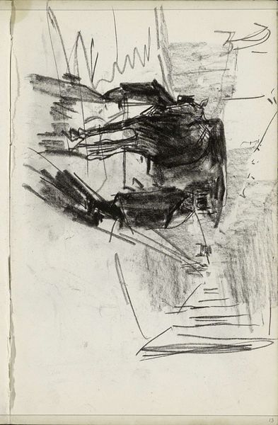 Curator: We are viewing "Os met kar in een bos," or "Ox with Cart in a Forest," an ink drawing rendered by Johannes Tavenraat around 1858. It’s currently held in the Rijksmuseum collection. Artist: Oh, wow, that’s intense. All that muted, earthy sepia…it's like a half-remembered dream or a spooky childhood story illustration. It definitely makes me feel a little melancholy. Curator: Note the artist's use of light and shadow. The dense strokes suggesting foliage on the left offer contrast to the right with the figure, a strong, dark silhouette dominating the middle. Artist: You know, that silhouette is so powerful. It anchors the whole piece, and there's this odd sense of stillness, but I get this feeling like the whole forest is pressing in on the ox and its cart. Like it's about to be swallowed up by the landscape. Curator: The composition employs a rather standard technique of balancing pictorial elements—verticality of the implied trees or the use of horizontal planes. But look closer at how Tavenraat subtly fractures and breaks it down using asymmetrical placement. It stops this scene from being entirely representational. Artist: Definitely, this image feels really unresolved. Those spindly branches, that barely-there sky… they seem to vibrate. You almost can’t be sure what’s in the shadows, can you? Like that fallen tree right at the bottom - I keep looking and imagining some little goblins hiding in there, ready to trip up the ox. Is that nuts? Curator: One could interpret this unresolved atmosphere through various theoretical frameworks to discern the psychological effect of such an imbalance and fragmentation within the artistic subject. Artist: For me it is also about the fact the cart is so un-detailed - like a ghost cart of sorts that suggests the unseen labors or struggles embedded in nature and perhaps our collective memories of landscape... or is that too abstract? Curator: A poetic, if unsubstantiated, observation that reminds me of some phenomenological descriptions of perception, but interesting to consider nonetheless. Artist: Well, this makes me want to grab a sketchbook and wander off into the woods, you know? Not to copy, but to get that shiver of mystery onto the page myself. Thanks! Curator: Indeed, thank you. A brief, if aesthetically and historically divergent, appreciation.