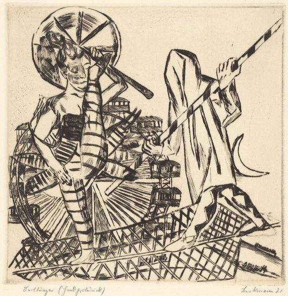 Editor: This is "Die Seittanzer" by Max Beckmann. It looks like an etching, with two figures on what appears to be a stage. The mood seems unsettling, with a hint of theatricality. What do you see in this piece? Curator: Notice how Beckmann uses the circus or stage setting as a metaphor. The figures become archetypes, laden with symbolic weight. Do you see how the dancer, with her rigid pose, contrasts with the shrouded figure? Editor: Yes, the hooded figure is really striking! What do you think it symbolizes? Curator: Consider the period in which Beckmann lived. The masked figure might represent the anxieties of the time, the uncertainty and hidden dangers lurking beneath the surface of everyday life. The dancer might be seen as a symbol of resilience or perhaps forced performance. Editor: I see! So the whole composition is a symbolic representation of societal tensions. Curator: Exactly! Beckmann uses these potent symbols to tap into our collective anxieties and memories. This adds layers of emotional complexity. It's fascinating how he uses universal symbols, right? Editor: I hadn't considered the cultural context. Now, it feels much richer. Thanks!