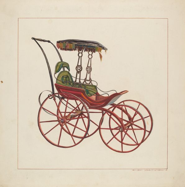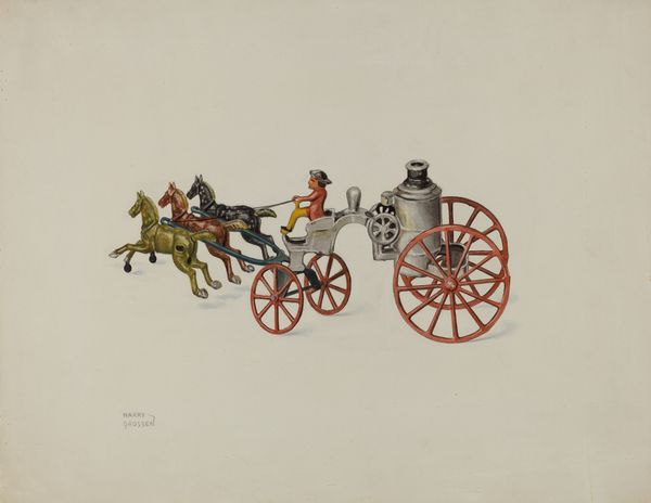 John Hall made this watercolor painting, "Calash and Horses," sometime in the late 18th century. At first glance, it's a charming image of a child's toy, a miniature carriage pulled by two horses. But it also offers a glimpse into the social and economic structures of Britain at the time. Hall was a historical engraver, appointed historical engraver to King George III in 1789, and this painting is likely a preparatory sketch for a print. The toy itself speaks to the burgeoning consumer culture of the era, where even children of wealthy families had access to luxury goods, reflecting the opulence and privilege of the aristocracy. The calash, a light, low-wheeled carriage, was a fashionable status symbol for ladies of leisure. To fully understand this image, we might explore sources like period toy catalogs, estate inventories, and social histories of the British upper class. In doing so, we can begin to reveal the complex social and cultural meanings embedded within this seemingly simple representation of a child's toy.