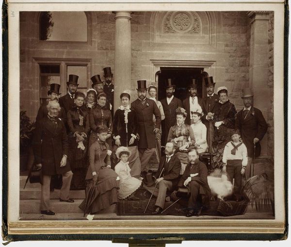 Editor: Here we have an untitled photograph from around 1868 by Mary Filmer, depicting a group at Cumberland Lodge. It feels quite formal and staged. What do you see in this piece? Curator: The rigidity speaks volumes. The group's arrangement, the architecture behind them, and even their clothing, all point to a very specific cultural performance. Notice how the doorway frames them, like figures in a religious painting. Editor: So, the setting and clothing are almost like symbols of status? Curator: Precisely. And consider the act of posing itself. It's a deliberate creation of an image for posterity, a claim to belonging and permanence. The very act of creating such an image speaks volumes about their self-perception. Editor: I hadn't thought about it that way. It really changes how I see the photograph. Curator: Indeed. Photography, in its early days, was so much more than just documentation. It was a ritual, imbued with social and personal meaning. It's interesting to think about what aspects of their lives are hidden or highlighted through this visual performance.