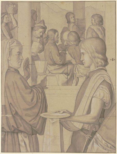 Curator: Charles Herbert's "Reduced Study of a Fresco, Representing Peter Released from Prison, by Filippino Lippi, in the Brancacci Chapel at Florence" captures a moment of divine intervention. Editor: My first thought is stillness—a deep, almost dreamlike quiet permeates the scene. Curator: Absolutely. Herbert hones in on the contrast between the angel liberating Saint Peter and the oblivious, slumbering guard. It's a powerful visual dichotomy. Editor: The halos almost feel like thought bubbles, emanating a sense of otherworldly calm. The guard leaning on his spear, utterly unaware, is almost comical. Curator: Herbert's study highlights the enduring symbolic weight of freedom—both physical and spiritual—within religious art and its persistent relevance through history. Editor: It’s fascinating how a copy can still evoke such contemplation. It makes you wonder about the original and the power of the narrative it embodies.