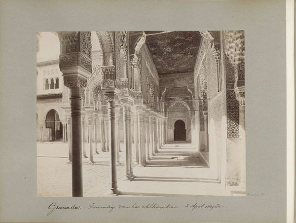 Curator: This albumen print, entitled "Leeuwenhof met de Leeuwenfontein in het Alhambra van Granada", captured by Rafael Garzón, invites us into the ethereal heart of the Alhambra's Court of the Lions, sometime before 1898. Editor: Wow. My first thought? "Order." Everything in it seems planned, measured, and perfectly balanced, despite the monochrome tones which usually don't lend to ethereal vibes. Like some perfectly organized ancient symphony frozen in a photographic moment. Curator: Precisely. That order reflects a deeper Islamic tradition of mathematics, philosophy, and spiritual harmony made manifest through architecture. Notice how the columns recede, their rhythm broken only by light and shadow. The fountain and its lion sculptures take central place. Editor: Yeah, and I love how those shadows elongate the columns, creating these otherworldly, slender silhouettes. It almost distorts our depth perception, like looking into a mirage. It's dreamlike! What's the deal with the lions anyway? Are they symbolic? Curator: Most certainly! In Islamic tradition, lions signify strength, courage, and nobility. But they also have more localized significance tied to the ruling dynasty that commissioned the court. Their presence infuses this courtyard with power, authority, and almost mythic regality. It subtly blends ideas of paradise with political statement. Editor: It's so neat how it all weaves together - those sturdy columns, ornate arches, the lion figures, even those watery shadows. Like looking at both a piece of art and a coded story. All playing with balance, space, power... Really impressive how a simple courtyard can carry so much cultural weight. Curator: Exactly! This photograph manages to freeze not only light but complex currents of culture and power in a deceptively serene moment. Editor: Totally! Now I'm going to daydream about reclining by that fountain and soaking up those symbolic lion vibes! Curator: Indeed. And as you linger, remember to consider how places shape not just our perceptions, but entire worlds of meaning and historical weight.