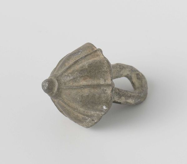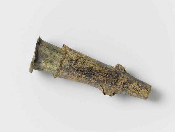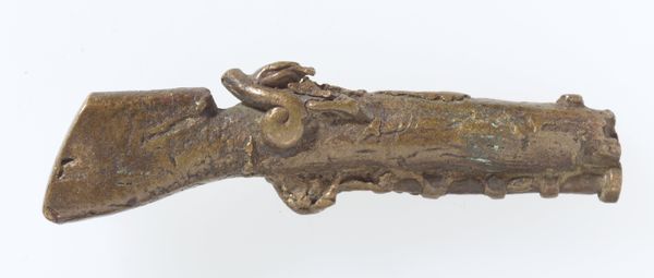 Curator: This brass sculpture, dated to the 19th or 20th century, is titled "Goldweight [Sword and Sheath]." It comes to us from the Akan people and resides at the Minneapolis Institute of Art. Its diminutive scale makes it feel precious. Editor: It does, it also suggests the miniaturization of power. What initially strikes me is its aged appearance—that patina really hints at stories of trade, of value exchanged, perhaps even struggles. It feels like it has witnessed history. Curator: The sword and sheath, as symbols, often represented authority, leadership, and the protection of community and trade routes. For the Akan, goldweights were also a means of preserving balance and fairness. This symbol could thus represent accountability of leaders and traders. Editor: Exactly. We should be conscious of what kind of authority it signifies. Who gets to wield it, and for what purposes? Power structures are never neutral, and this object reflects historical imbalances and potential conflicts that continue to echo. The decoration reminds of colonial influences as well. Curator: Look closely at the handle – doesn’t the stylized form almost recall a lineage of power, with each shape representing different ancestral forces coming together? Perhaps representing various clans uniting in decision making? Editor: That interpretation adds layers, thinking about not only power but the careful negotiation and ancestral foundations that leadership should stand upon. But it also makes me consider the weight of that tradition— who is included and who is excluded? Curator: It invites careful consideration of context. Though small, this "Goldweight [Sword and Sheath]" opens up huge areas of dialogue. Editor: Absolutely, a valuable tool to look critically at how historical objects reflect contemporary struggles for equity.