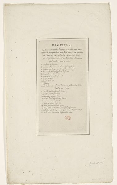 Editor: So, here we have an engraving from 1663, “Register voor: Secunda pars” by Artus Quellinus I. It’s currently held in the Rijksmuseum. The aged paper and dense typography give it such an austere, intellectual air. What strikes you when you look at this, compared to contemporary art? Curator: You know, it’s like gazing into a perfectly preserved time capsule. Imagine Amsterdam in 1663, brimming with this newfound wealth and self-confidence, commissioning artwork. The precision of the engraving, the formality of the typography – they scream of a society obsessed with order and cataloging the world around them. It’s not just about aesthetics, but also about solidifying their burgeoning cultural identity. What do you make of the Baroque style blending with the Dutch Golden Age sensibility? Editor: It's almost a conflict. The Dutch Golden Age, with its realism, combined with Baroque flourish. Is the register more about Dutch practicality or Baroque exuberance? Curator: Precisely! Think of the Amsterdam City Hall itself, which this engraving documents through prints of its sculpted decorations. It’s a statement piece. This image serves as the key to unlocking all those symbolic layers Artus Quellinus embedded within the sculptures. I’d argue it represents an attempt to ground exuberant Baroque idealism within the level-headed world of Dutch commerce and governance. Do you see that tension reflected in the stark monochrome? Editor: Absolutely, a conversation between precision and grandeur. Curator: Exactly. And that tension, that careful balance, tells us so much about the spirit of the Dutch Golden Age itself. Looking closer makes me question our definitions. What's exuberant about an engraving? Is that exuberance the ambition, not in curves, but in precision? Editor: It makes me think about how documentation can also be art. It's not just capturing something, it's framing it. Curator: You've hit it, absolutely. And by framing it, transforming it into something entirely new.