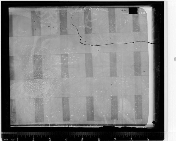 Editor: This is an X-radiograph of Robert Feke's "Portrait of the Royal Family," housed at the Harvard Art Museums. The ghostly image reveals so much of the material history. What details of the composition stand out to you? Curator: The linear patterns are striking. Notice how the density varies, suggesting underpainting or perhaps alterations made by the artist. The structure, in essence, betrays its history. Editor: So, the visible lines and tones aren't necessarily representative of the final artwork? Curator: Precisely. The radiograph exposes the infrastructure of the painting. What do you make of the varying densities in relation to artistic intent versus physical reality? Editor: I never thought about analyzing art in this way, focusing on the material rather than the subject. Curator: Indeed, it offers a unique perspective. Materiality becomes meaning, revealing the hidden dialogue between artist, process, and time.