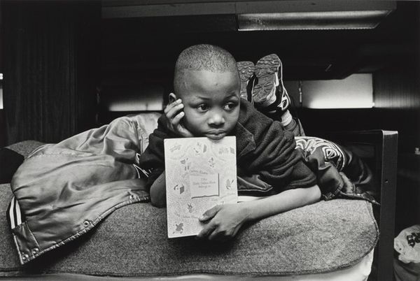 Editor: This is Roy DeCarava's "David," a gelatin silver print from 1952. The mood hits you immediately, doesn’t it? The boy's expression…it’s so direct, but there's a vulnerability there too. What do you see in it? Curator: That raw feeling. Exactly. For me, DeCarava’s work always whispers, never shouts. Look at the way he uses light. It isn't dramatic, theatrical, but incredibly intimate. The way it glances off the boy’s forehead, those almost imperceptible details, you know? It reminds me of growing up in Harlem, you can smell the asphalt after rain. Do you sense that connection to the Black Arts Movement in this? Editor: Definitely. There’s a strong sense of realism, just documenting life as it is, but I guess I hadn't really tied it to that specific movement. Is that what distinguishes it from other street photography of the time? Curator: Partly, yeah. But DeCarava also focused on the interiority of his subjects, not just external appearances. The choice to print it in deep, rich blacks... It adds a certain weight. What does that Hawaiian shirt tell you, juxtaposed against his solemnity? Editor: Hmm. I guess it’s that contrast that really gets me thinking, the boy seems both tough and so fragile at the same time. So this photograph presents so much in a such simple, visually accessible composition! Curator: Precisely. It invites empathy and offers such a tender representation of the every day, that many had never considered. It invites contemplation about being Black in 1950s America. Makes you wonder about the stories behind those eyes, right? Editor: Absolutely. Thanks for sharing all those different angles to consider – really changed how I see this piece. Curator: My pleasure. That's the beauty of art, isn’t it? A single frame holding a whole universe of meaning and emotion.