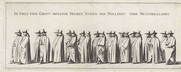 Curator: This engraving, Pieter Nolpe’s "The Funeral Procession of Frederik Hendrik," created in 1651, shows a segment of the elaborate procession. What strikes you first? Editor: The procession appears quite regimented and dignified, and the repeating figures and flags have a somewhat ceremonial air, wouldn't you say? How should one approach such a work, knowing that it depicts not just a historical moment, but a carefully constructed public display? Curator: Exactly! Consider that Nolpe isn't merely documenting; he's constructing a narrative, perpetuating an image. Note the banners, each carried with purpose. Think of flags less as identifiers, and more as vessels of cultural memory. The ‘Orange’ banner, for example, embodies the aspirations and the very identity of the House of Orange. Do you see how the symbolic weight carried here might shape public perception? Editor: I do, the banners would have told their own story even without words. So, understanding these symbols would be critical to deciphering the complete picture? Curator: Precisely. Also consider the horse draped in heraldry - a symbol of power and lineage. What does its presence contribute, removed from actual battle? What’s its psychological effect on onlookers? Editor: I see it emphasizes the enduring power and legacy of Frederik Hendrik beyond just his military prowess. The visual language really drills the narrative in, doesn't it? I’ve never considered how powerfully images work to solidify ideas and beliefs over time. Curator: The beauty of art is precisely in that power – its enduring capacity to carry coded cultural information forward, beyond language. Editor: It’s fascinating how much more there is to this image than just a record of a funeral.