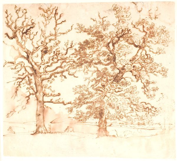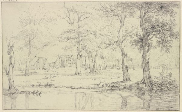 Dankvart Dreyer created this drawing, "Dammen ved Hammermøllen," with pen and brown ink. The composition is dominated by horizontal lines of the water against the vertical strokes used to suggest trees and foliage, creating a sense of depth. Dreyer uses a semiotic system where strokes and lines act as signs, converting the natural world into an abstract but recognizable form. The light-filled sky contrasts with the darker, denser thicket, constructing a binary that invites us to contemplate the dialectical relationship between light and shadow, clarity and obscurity. Notice the way the artist uses the formal element of line to delineate shapes, create texture, and structure the composition. The formal elements create a discourse around representation, inviting us to question the relationship between the signifier, or the artwork, and the signified, the natural world it represents.
