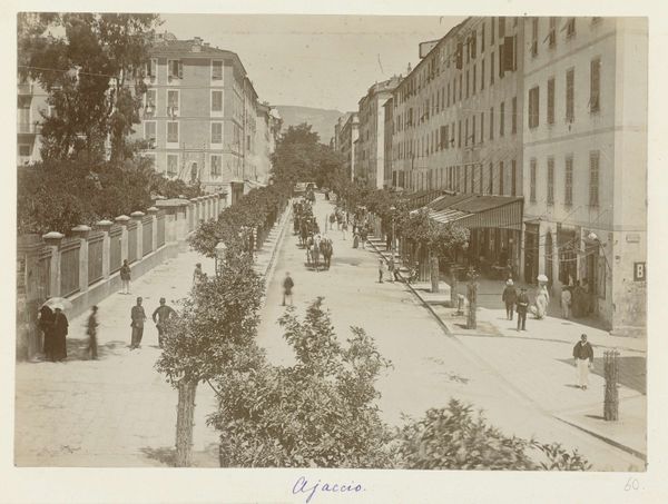 Curator: Editor: This is Étienne Neurdein's "Gezicht op Rue d'Antibes te Cannes," taken in 1896. It's a photograph, capturing a street scene. I'm struck by the everyday feel, the people going about their business. What historical narratives do you see unfolding in this image? Curator: What I see is a carefully constructed representation of class and commerce in late 19th-century Cannes. Consider the deliberate composition – the wide street, the placement of figures, and the shop signs. Who is this image for? Whose story does it tell, and whose does it erase? Editor: That’s interesting, I was focusing on the realism of it. So, are you saying that this "realism" is actually staged to present a specific point of view? Curator: Precisely! Think about the concept of the flâneur, the detached male observer wandering through the city. This image seems to offer that perspective, but we need to question that. Where are the women in this scene, and what roles are they allowed to occupy? Are there power dynamics at play in framing the working class this way? Editor: I hadn't considered the flâneur aspect and the implications for gender. It's making me rethink the gaze within the image itself. Curator: Exactly. Now consider that Neurdein was catering to a growing tourist market. How does this image romanticize or sanitize Cannes for potential visitors? What’s being sold here beyond just the scene itself? Editor: So it's not just a picture of a street, but a marketing tool, subtly reinforcing social and economic hierarchies. It really makes you consider who benefits from these types of images. Curator: Absolutely! And by understanding that, we can start to unpack the broader cultural and political contexts in which it was created and consumed. Editor: I’ll definitely look at images with a new set of questions from now on! Thank you for highlighting the nuances within what seems like a simple snapshot.