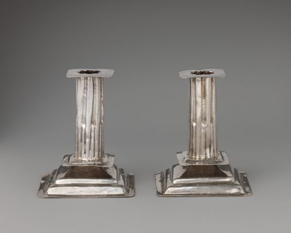 Curator: Ah, yes, here we have a pair of silver candlesticks, crafted around 1694-1695, attributed to Thomas Ash, currently residing at the Minneapolis Institute of Art. Editor: Oh, they’re strikingly austere. Imposing in a quiet, reflective way. Like silver sentinels guarding…what secrets do you think they hold? Curator: Well, considering the Baroque period in which they were made, these candlesticks likely graced the tables of the elite. Imagine them casting flickering shadows across powdered wigs and hushed conversations about politics and power. Editor: Powdered wigs. Right. It's easy to get caught up in the romance, isn’t it? But I’m more drawn to thinking about the intense societal hierarchies of the late 17th century that these pieces represent. Silver, especially objects of this size and intricacy, signified immense wealth. Curator: Absolutely, they are emblematic of a time when the aesthetics of luxury reinforced the existing social order. The very form echoes classical architecture, don't you think? Each candlestick is like a miniature fluted column. It gives them a sense of enduring importance. It also emphasizes the beauty of simple form elevated through exquisite craftsmanship. Editor: And the labor! We mustn’t forget the labor behind them, often extracted under exploitative conditions. When we admire their shimmering surfaces, it's essential to remember the human cost of such lavish displays. The Baroque era’s obsession with ornamentation was always underpinned by exploitation and inequity. Curator: True. Still, looking at the technical skill, I find a kind of alchemy there –base metal transformed into something radiant, almost spiritual. The light playing across those carefully wrought surfaces… it hints at a certain transcendence. Perhaps the aim was to elevate earthly existence, however briefly. Editor: And perhaps we can see them now as artifacts demanding introspection. Not just shining objects, but reminders of a complicated past. Curator: So, they are light-bearers of more than just wax, but memory, and history, reminding us of who we are and where we’ve come from. Editor: Illuminating indeed.