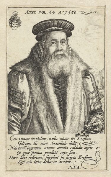 Editor: This engraving, "Portret van de meesterzanger Johan Spreng" by Dominicus Custos, dating sometime between 1579 and 1615, really captures your attention with its intense focus on the subject’s face and beard. It gives off an air of importance and scholarly weight, but I wonder what kind of status these portraits served at that time? What do you see in this piece, from a historical perspective? Curator: The interesting aspect about this portrait is its intersection of social status and visual representation. Consider that prints like these, especially portraits of notable figures, played a crucial role in shaping public perception. This engraving, more than just capturing Spreng’s likeness, actively constructs his image as a learned and influential man. Editor: How so? Is it because he’s holding the book? Curator: Precisely. The book signals intellectual prowess, associating him with the world of learning and ideas. The ornate emblem or coat-of-arms on the wall adds another layer, suggesting family prestige and linking him to established power structures. Now think about the context: the Northern Renaissance. How did portraiture function differently in societies influenced by the Reformation, as compared to, say, Italy? Editor: Hmmm... So, less about celebrating personal glory and more about solidifying social standing within a community? Curator: It's more nuanced, but essentially, yes. Portraits could serve a moralizing function. In the Northern Renaissance, there's often this interplay between showcasing individual accomplishment and reinforcing social order. What's been your main take-away after reviewing the art piece? Editor: That I often miss the bigger picture when considering a piece without understanding what historical and cultural environment created it, and what messages they carried to their community. Curator: Absolutely! Context allows us to really *see*.