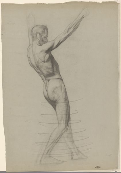 Curator: At first glance, it evokes a strange stillness, like frozen energy, the body caught mid-action but oddly inert. Editor: Indeed. This is a photograph, before 1879, taken by Giorgio Sommer depicting a bronze sculpture of an athlete currently residing here in the Rijksmuseum. The work obviously invokes classical ideals. What does this kind of figure represent for you? Curator: The classical allusion is strong. I see here a tension, common throughout depictions of athleticism—the godlike physique suggesting mastery over the physical self, yet the implied vulnerability inherent in motion. His pose seems both ready and hesitant, like a moment before a choice is made. Editor: And isn’t that a conscious element of these pieces? A sort of didactic attempt to elevate sporting achievements to that of philosophical import. Ancient Greece, for example, closely tied the aesthetic form of the human body to moral character, or ‘kalos kai agathos.’ Sommer’s photograph isn't just capturing a sculpture. It's capturing a specific cultural aspiration. Curator: Precisely, the enduring symbolism of athletic prowess—discipline, focus, even a kind of purified existence. It represents human potential striving towards a perceived perfection. It reflects aspirations. Editor: The circulation of imagery like this played a significant role in solidifying classical ideals within 19th-century European visual culture. Photography aided these values in their dispersal to the wider public who visited museums but also engaged with these aesthetics in print and other mediums. Curator: And yet, the photograph itself adds another layer. Sommer freezes the sculpture in time, immortalizing it, granting the bronze athlete yet another level of symbolic weight beyond its creation, or subjecthood within a museum collection. Editor: Absolutely, in photographing this sculpture, Sommer enters a complex historical dialogue about beauty, strength, and the cultural work of preserving classical ideals for new generations. Thanks for joining me to unpack these nuances. Curator: The pleasure was all mine; thank you for enriching the moment with history.