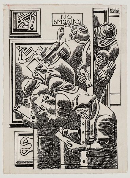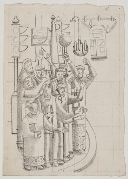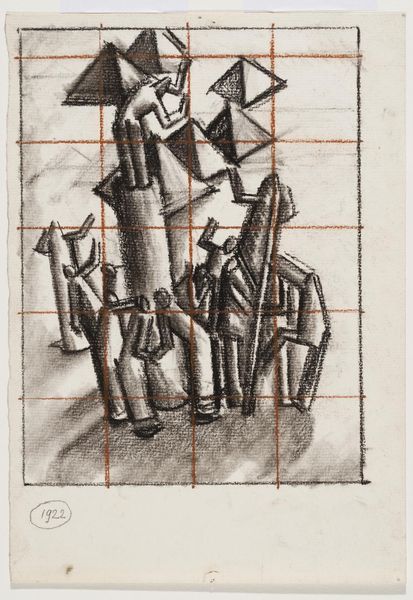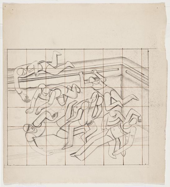 Editor: This is William Roberts's Study for 'Bullfight'. The drawing doesn't have a specific date, and it's on display at the Tate. It looks like pencil on paper. I am intrigued by its geometric shapes and the grid underlying the composition. How does the composition function in this piece? Curator: The grid certainly provides a structural foundation. Consider how Roberts uses flattened forms and cubist-inspired techniques to depict the figures. Notice the interplay of lines and angles, creating a sense of dynamism and tension. How do these formal elements contribute to your understanding of the bullfight? Editor: I see that the overlapping shapes create a chaotic energy, almost like the movement and drama of the event itself. It makes me think about how even a preliminary drawing can convey so much through form alone. Curator: Precisely. Roberts transforms the bullfight into an arrangement of shapes and lines, emphasizing the abstract qualities of the event. We understand through his technique.