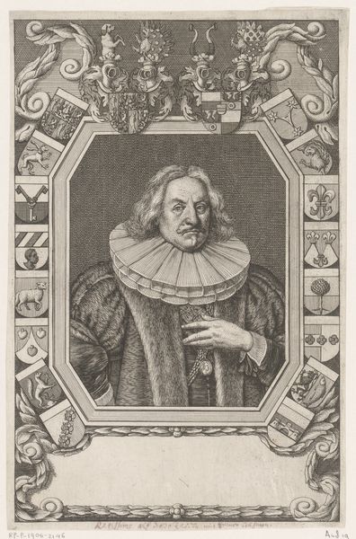 Editor: So, this engraving, "Portret van Johann Nürnberg" by Johann Alexander Böner, was made in 1667 and it’s held at the Rijksmuseum. I'm struck by the formality, and also by the presence of the text below the figure... it seems crucial to understanding the print. What jumps out at you when you see this, from a historical perspective? Curator: The first thing I notice is how this image functions within a larger system of civic representation. Here, we see Nürnberg as a member of the city council, a figure whose likeness is being circulated publicly through print. The text below reinforces this, functioning almost as a legitimizing caption within a formalized institutional context. The style itself, typical of Baroque portraiture, emphasizes the sitter's status through costume, pose and symbolic attributes. Consider how the institution *itself* of city government creates a context for images like this, giving meaning and weight to this person's depiction. What do you think the artist is trying to say? Editor: That his likeness and his name are important for the function of government? Curator: Precisely. It's about making civic leadership visible and giving it a tangible form, promoting a certain vision of order and authority within Nürnberg's society. And engravings are crucial, given the technology of the time, to achieve visibility. Editor: So, it's less about his personal story and more about his function in a larger civic narrative? Curator: Exactly. The personal is almost entirely subsumed by the public role. Which isn’t necessarily saying he *didn’t* commission the portrait to memorialize himself… simply that it operates inside of a political framework. I keep wondering… how many copies of this print circulated around Nuremberg? Editor: This makes me see portraiture of this era very differently. It seems portraits weren't just records but instruments of governance. Curator: Yes, visibility, authority, permanence – it's all part of the same political language, expressed through the image and its reproduction. Thank you for making me see a more powerful angle in that artwork.