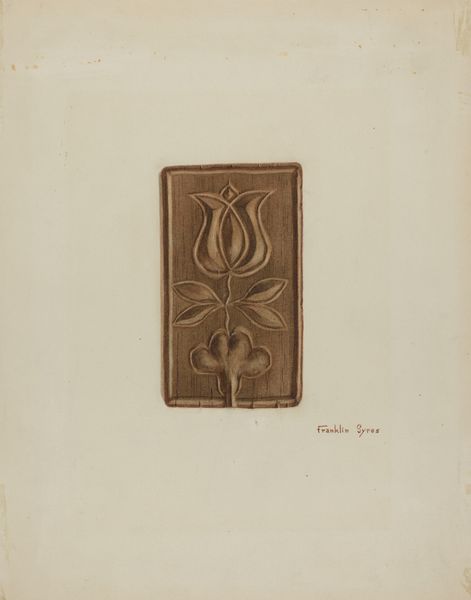 Editor: This is a drawing titled "Mantel Carving" made in 1939. It looks like a design for a wood sculpture, maybe part of a fireplace. I notice that the shape is very symmetrical, and the style feels traditional. How do you interpret this piece? Curator: The symmetry certainly strikes me too. Consider the image of a rosette, or perhaps even a highly stylized compass rose. What do those forms signify across cultures? Editor: Navigation, direction, maybe finding your way home? And the rosette maybe implies beauty or virtue? Curator: Precisely. The symmetry emphasizes balance and order. What do you make of the oak leaves and acorns? Considering this was made in 1939, what connotations might oak leaves evoke? Editor: Strength? Oak trees can live for hundreds of years, so maybe longevity or steadfastness? Given the year, are we perhaps thinking of a connection to heraldry or nationalism? Curator: It’s possible, and symbols shift in meaning. Consider, though, how often such imagery is found in domestic settings—the hearth as a symbol of continuity. Does the repetition change how you see the work? Editor: That’s interesting, it makes it feel a little less imposing and maybe more about family and history. I wouldn’t have noticed all those layers of symbolism without your help. Curator: Indeed. This exploration reminds us that cultural memory often speaks through the language of repeated forms and symbols.