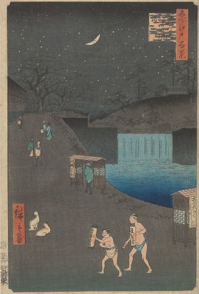Editor: This woodblock print, “113. Aoi Slope Outside Toranomon Gate,” was created in 1857 by Utagawa Hiroshige. The scene feels so calm and almost secretive, set at night with people carrying lanterns. What draws your eye when you look at this piece? Curator: For me, it’s the staging of public life against a backdrop of Edo-era infrastructure. Consider the role of the Toranomon Gate, not just as a physical boundary of the city, but as a symbolic threshold. This print, part of "One Hundred Famous Views of Edo," was made at a time when Japan was on the cusp of massive social and political change. Editor: What kind of change? Curator: The end of the Edo period was marked by growing internal dissent and external pressure to open Japan to the West. Hiroshige's prints were in high demand, particularly because of loosened restrictions from the Tenpō Reforms that caused social reforms during this time. I see this piece almost like a nostalgic reflection, romanticizing a fleeting way of life that would soon disappear because they weren't as strict. The stars overhead and the figures along the roadside contribute to the charm, sure. Editor: So you are saying that Hiroshige wasn't just capturing pretty scenes? Curator: No, not only! These views were also deeply tied to the marketing of Edo, projecting its cultural values, and even indirectly commenting on its socio-political dynamics, think of ukiyo-e as something similar to advertisement! Even those dogs lounging in the lower left, they're a detail but could also signal leisure and peace during increasing uncertainty. How might that understanding shift our view of ukiyo-e today? Editor: I hadn't thought of it like that before. It adds so much depth knowing about the societal shifts occurring at that time. I see how seemingly simple landscape print reveals so much more about the public sentiment of an era. Curator: Exactly, art is seldom just what is depicted. Looking at who creates art, why, and under what societal conditions, grants so much deeper knowledge and informs social narratives in history.