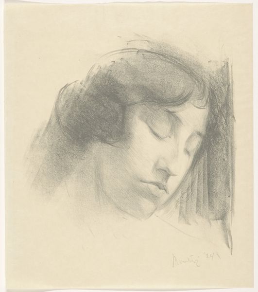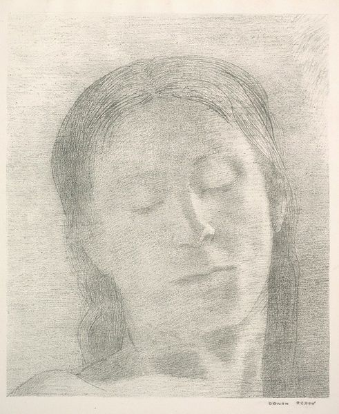 Curator: Let’s discuss Odilon Redon’s “Yeux Clos,” or “Closed Eyes,” a lithograph from 1890. What's your immediate take on it? Editor: Haunting, but with a serene hush over it. She's floating, but not in a way that feels dramatic – more like gently adrift. Almost like an Ophelia freed from all that drowning. The lack of color, the subtle gradients... dreamy. Curator: Redon, associated with Symbolism, sought to represent interior visions rather than external realities. The print comes at an interesting time for the artist—after the official recognition by critics in the 1880s. Note, how the subject almost disappears in the upper background through soft, diffused shading. Editor: That diffused shading feels incredibly modern, almost like the kind of background blur you get on a phone camera. It isolates her, makes her seem like a thought. A private, maybe melancholy thought. Are her eyes closed in sorrow or reflection? Both? Curator: Symbolist artists often evoked feelings through suggestive forms and ambiguity, and, socially speaking, we see here a retreat from the industrial, external world. Lithography allowed Redon to explore tonal variations and textures that reinforced the dreamlike, psychological state he aimed to convey. Editor: And it’s interesting too, thinking of it as a print, meant to be reproduced. The solitude of it—almost contradicts that. Like sharing a secret vision or a particularly poignant dream that is supposed to have been experienced communally. The "message" of the work is almost hidden through the delicate quality of the image. Curator: A fine point to make. This kind of sharing invited engagement but perhaps to reinforce inwardness rather than the social reform so much in discussion in artistic circles at the time. It represents the rise of modern individualism in some sense, that art had a therapeutic use that must not be confused with political agendas. Editor: A closed, or even closing, window into someone else’s interiority. It doesn’t need to do more than exist, right? Its purpose is served the instant the work is done, like releasing a sigh. And from there the sigh moves around the world, detaching more things, causing change everywhere… Curator: Perhaps, we’ve both just gestured at why the Symbolists resonate still with our audiences today—this search for meaning, not through narratives, but states of being that they embody in unique, intensely introspective visual languages.