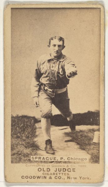 Editor: So, this albumen print is a baseball card from between 1887 and 1890. It’s a portrait of Chas. Brynan, a pitcher for Chicago, produced by Goodwin & Company for Old Judge Cigarettes. What strikes me is the action pose; it's a little frozen, a split-second caught in time. It makes me think about those early days of baseball. What do you see when you look at it? Curator: Well, for starters, I see nostalgia, filtered through sepia tones and the hazy lens of history. Can you imagine holding this tiny card, scented faintly of tobacco, dreaming of baseball glory? It's a tangible piece of Americana, isn't it? Goodwin & Co. were quite clever; they linked virility and athleticism, embodied by Brynan, to their cigarettes. Do you think that sort of marketing tactic holds up today? Editor: Hmm, maybe, but differently. The athleticism, sure, but now we’re more conscious of health implications. Still, what’s really fascinating is the shift from posed portraits to these more dynamic shots. Curator: Precisely! It’s not just a baseball card; it's a document of changing sensibilities. The albumen print gives the photograph this wonderful luminosity, don’t you think? And Brynan himself... Look at his determined gaze. Almost feels like you're looking straight into the Gilded Age. Makes you wonder what he was like. Editor: It really does. It bridges a century, and a sport I adore, into a little slip of paper. Definitely gives me something to think about, thanks. Curator: My pleasure. History whispered, indeed. Let's keep listening, shall we?