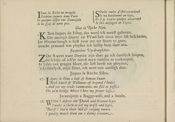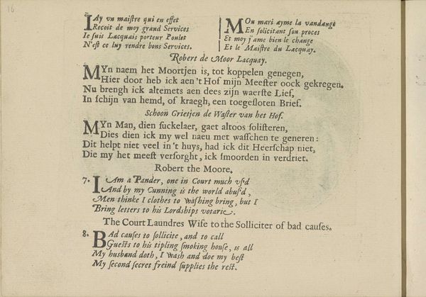 This is a print made in the Netherlands in the 17th century by Crispijn van de Passe II. It combines text and image to explore social themes. The print presents a series of verses, each associated with a different female character: a starcher, a chambermaid, and a washerwoman. The verses offer glimpses into the lives and perspectives of these women, hinting at their daily routines, social interactions, and personal desires. These characters represent different strata of society, reflecting the social hierarchy and the roles available to women in 17th-century Dutch society. This work reflects the growing interest in social realism during this period. Artists and writers began to depict everyday life, challenging traditional artistic norms and offering a more democratic view of society. By focusing on the lives of ordinary women, the print invites viewers to consider their place in the social order and to question the institutions that shaped their lives. To understand this print better, we might consult archives, personal letters, and other documents that shed light on the lives of women in the 17th century.