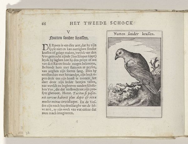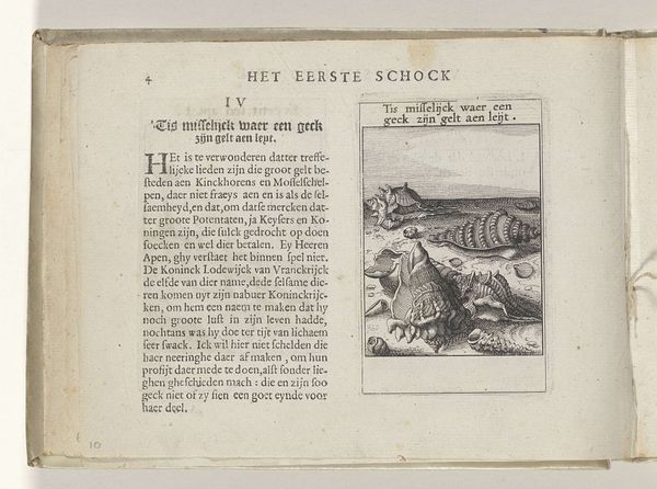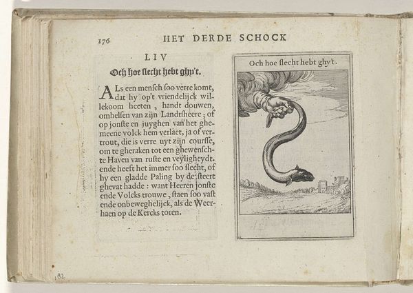 Editor: This is "XXXVII Thuys best," an engraving on paper by Roemer Visscher, dating back to 1614. It’s got this intriguing old-world feel with the printmaking. What do you see in this piece, beyond the surface? Curator: Beyond the simple depiction of a tortoise, I see a powerful commentary on societal expectations and personal identity. Given the time period, the Dutch Golden Age, we need to consider the rise of mercantile power, exploration, and burgeoning individualism alongside strict social and religious norms. Editor: So, the turtle not going to Jupiter’s feast – how does that tie in? Curator: The text alongside the image is crucial: only the tortoise remains behind; when asked why, he responds: 'East, West, home is best.' Considering the social mobility of the time, many felt pressured to participate in increasingly global, materialistic, even exploitative ventures. The tortoise can represent those who choose a more grounded existence, who resist that pull. This creates a pointed perspective, right? Editor: Absolutely, almost an early form of protest, about being true to yourself and your values, I suppose. Curator: Precisely. Visscher encourages a deeper interrogation. Is this a celebration of self-sufficiency or a critique of social withdrawal? Editor: I see it now - a rejection of social pressures. I initially just thought it was a quirky image. It has so much more depth! Curator: Exactly, engaging with historical context allows us to see how art engages with broader societal debates about morality, wealth, and belonging. We can even draw a comparison to today's ideas about sustainability and community.