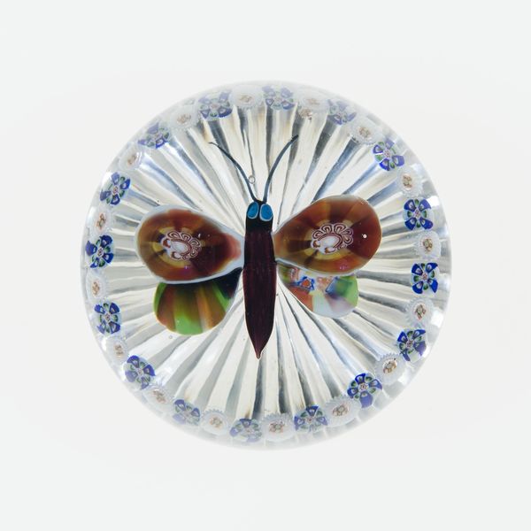 Curator: My eye is drawn immediately to this enchanting glass paperweight, likely crafted by Baccarat Glassworks between 1848 and 1855, currently residing at the Art Institute of Chicago. What are your initial thoughts on it? Editor: It's striking! The encapsulated butterfly gives a sense of wonder, almost like a frozen moment of metamorphosis captured in glass. The circular form radiates outwards, creating a captivating microcosm. Curator: Absolutely. The paperweight as an object became extremely fashionable at this time, especially amongst the rising middle class. These were objects for display, designed to be admired, and, critically, affordable signifiers of taste. Editor: It certainly speaks to that fascination with the natural world that permeated the Victorian era. Butterflies in particular, representing transformation and the soul, were potent symbols. Their inclusion elevates it beyond mere decoration. Curator: That's perceptive. Mass-produced, perhaps, but carrying very potent symbolic weight. It reflects an era of industrial capability catering to emerging bourgeois aspirations of refinement, all underpinned with rich imagery. Editor: The vibrant colors, especially in the butterfly’s wings, really grab attention. They are somewhat abstracted—not perfectly naturalistic, but hinting at something deeper. Each spot and stripe seems meticulously placed. Does it echo any larger cultural trends in visual art at the time? Curator: Definitely. The development of increasingly affordable and more vivid pigment is critical in understanding its reception. Consider this work alongside botanical illustration, where advances in printing and pigment technologies were shaping the public understanding and representation of flora and fauna. These paperweights were effectively democratizing these kinds of imagery. Editor: Fascinating! I see it as a tiny stage, a carefully constructed diorama where nature is tamed, frozen, and presented for admiration, while the form of the butterfly hints at a broader narrative of change and fleeting beauty. Curator: Precisely, an assertion of human control, a memento mori within a sphere, shaped by—and reflecting—its own cultural context. It is more than just a beautiful bauble. Editor: A perfect summation— a potent little artifact offering such depth of insight, sealed for eternity.
