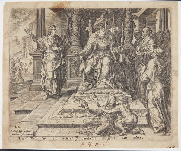 Editor: Here we have "Juno en Jupiter vragen raad aan Tiresias," an engraving by Hendrick Goltzius, dating somewhere between 1590 and 1728. It's striking how much detail he manages to achieve using just lines. What formal elements stand out to you in this composition? Curator: The linearity is indeed paramount, shaping the very structure of this visual plane. Observe how Goltzius masterfully employs hatching and cross-hatching, not just to delineate form but also to modulate light and shadow, effectively creating depth. The interplay of these graphic elements produces a rich visual texture. Editor: Yes, the texture is compelling. And the contrast between the figures of Juno and Jupiter versus Tiresias in his interior is remarkable. The composition almost splits the scene. What do you make of this? Curator: This compositional bifurcation invites us to consider the spatial dynamics. Note how the artist has deliberately juxtaposed the implied vastness beyond the architectural structure framing Juno and Jupiter against the contained, almost claustrophobic, domestic interior inhabited by Tiresias. Is it a mere division of space or also of opposing ideas? Editor: That’s a compelling point! Considering it further, what is emphasized to me now is the diagonal division that places more value and definition on Juno and Jupiter, using architecture as its compositional element. But how does that contribute to the narrative, or does it at all? Curator: Think about it - if we only look at the surface level as we initially might, we will be caught up on the superficial plane, neglecting to understand deeper intrinsic details. In terms of the organization of graphic forms, a certain equilibrium seems to emerge. And this has allowed us to explore new meaning through the artwork, that is in turn rewarding! Editor: That's given me so much to think about, especially regarding how initial readings can be expanded. I didn't really think the architecture could affect my interpretation of narrative. Thank you.