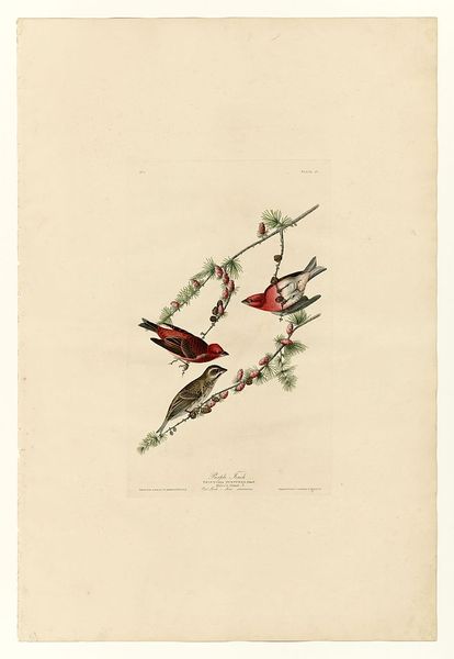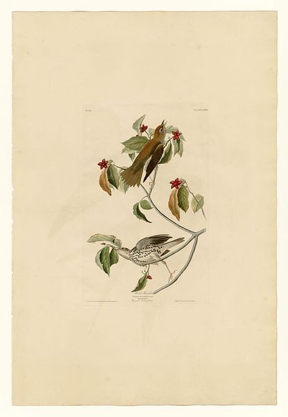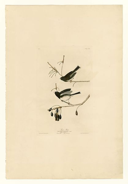 Curator: Welcome! We're standing before "Plate 25. Song Sparrow," a lithograph and ink drawing on paper, believed to be by John James Audubon. Editor: The birds look like they are posing, frozen. Maybe the moment just before taking flight... like they're captured and pinned down to the page, forever about to burst forth. There is an unnatural calm for being stuck on that paper... Curator: Audubon's approach to capturing nature, especially birds, was deeply connected to Romanticism. There's this palpable sense of the sublime wilderness tamed, reduced, displayed— almost like trophies? I see that feeling particularly strong when they are grouped. It creates an unsettling composition. Editor: Indeed, you're right—there is such unease in Romantic renderings of the natural world. Focusing on the making, I’m particularly drawn to how Audubon and his team utilized printmaking to make this accessible, an artistic rendering democratized in some ways. It moved nature study beyond wealthy patron collections of original drawings. He, too, wanted a buck, like any business. Curator: The distribution aspect is fascinating—especially how it clashes with this idea of the solitary, untouched wilderness so celebrated in the Romantic period. It highlights this tension between the artistic interpretation of nature and its practical exploitation. A fine rendering can never fully show reality, too. He likely had taxidermied models sitting next to him as he put pen to paper! Editor: The very materiality of this print speaks volumes about Audubon’s world—from the rag paper that served as his canvas, made from discarded clothes and linens by countless laborers, to the ink derived from minerals. These processes of art production depended on industrial processes. The whole creation of the piece brings attention to what it conceals. The labor that made this moment, this sparrow, linger! Curator: Absolutely. And thinking about that, and how this seemingly innocent image involved resource extraction and exploitation, certainly alters my perception. Thank you, I never saw it in this manner. Editor: Thanks for letting me share. Seeing the whole picture of art and the world makes everything that more rich.