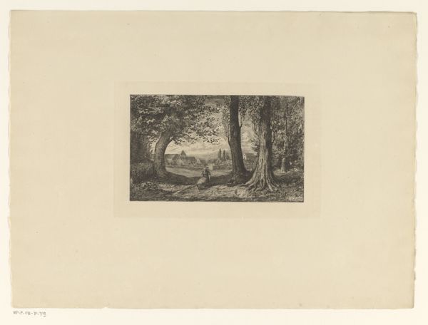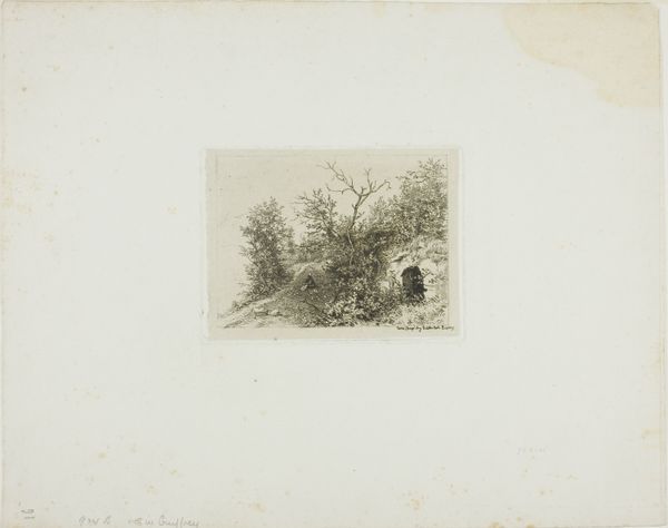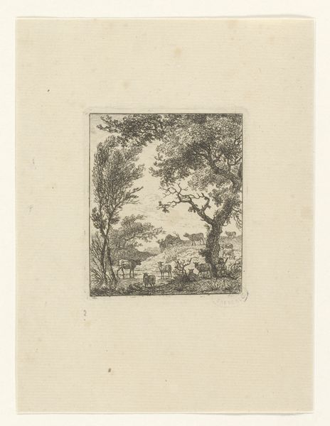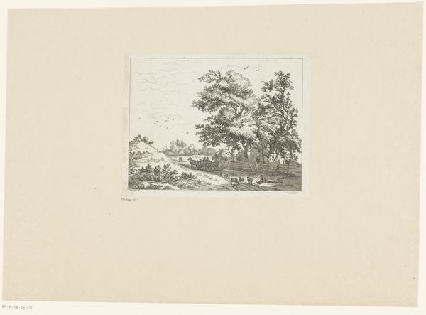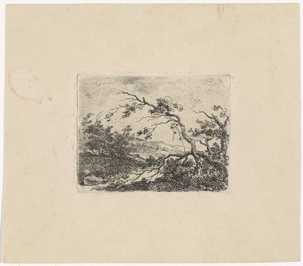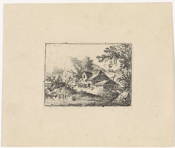 Paulus Kerkhof created this landscape with two houses using etching techniques. The composition draws you into a tranquil yet dense scene through the interplay of light and shadow achieved by closely laid lines. The cross-hatching defines the forms of the cottages and foliage, yet the overall effect destabilizes any clear distinction between structure and nature. There's a tension here, almost a semiotic disruption, as traditional landscape elements are rendered in a way that challenges our perception of space and depth. Notice how the density of the lines creates a texture that is almost tactile, inviting a haptic, rather than merely visual, experience. This etching goes beyond representation; it engages with the philosophical discourse of its time, questioning fixed perspectives and inviting viewers to reconsider their relationship with the natural world.