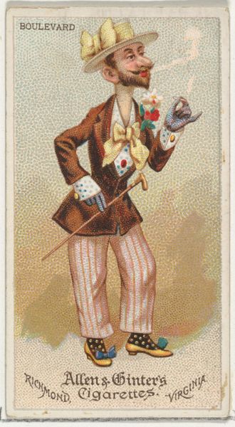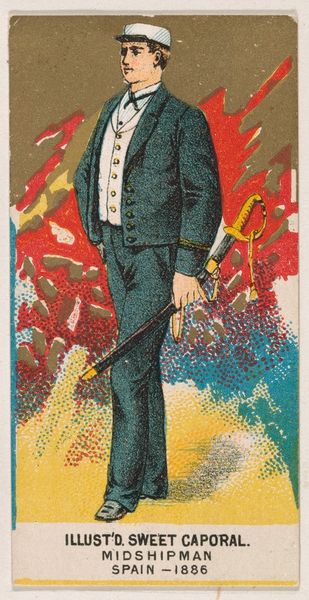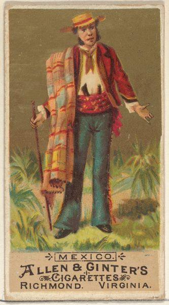 Editor: Here we have "Mexican, from World's Dudes series (N31) for Allen & Ginter Cigarettes," a print made in 1888. The figure’s bold, stylized outfit strikes me as quite theatrical. How do you see the formal elements working in this piece? Curator: The immediate appeal rests in the orchestration of color. Observe how the artist manipulates a predominantly earth-toned palette, punctuated by the vibrant red and blue in the figure's garb. Note, too, the layering of textures—the rough hatch marks rendering the coat against the smoother planes of the face. How might you describe the use of line throughout? Editor: I notice a combination of sharp outlines and more delicate, almost faded lines in the background. Does this contrast in linework serve a particular purpose in structuring the image? Curator: Precisely. The pronounced outlines delineate the figure, anchoring it in the foreground. The diffused lines in the background, depicting a generalized landscape, create depth without distracting from the central subject. We see an interesting interplay between flatness and the illusion of three-dimensionality. What is your view on how that flatness of the picture affects the meaning of the subject matter? Editor: It makes the figure feel very present, like a constructed image rather than a realistic depiction, emphasizing its status as a “type” of Mexican man more than an individual. Curator: Indeed, by prioritizing line, color, and texture, and strategically employing varied styles of linework, the artist crafts not a portrait, but a visual signifier. A type that flattens and essentializes a national identity through a calculated arrangement of formal properties, prompting critical reflection. Editor: It’s fascinating to see how formal elements can speak to the work’s intent and its historical context! Curator: Indeed, it illustrates the powerful impact that formal analysis can have on cultural interpretation.