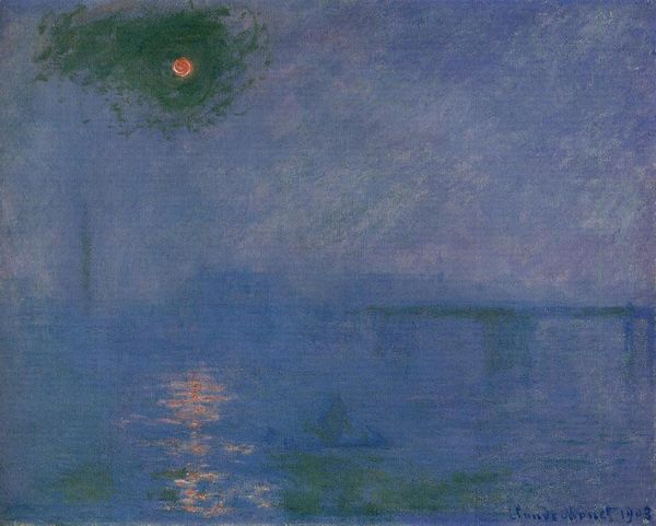 Editor: So, this is Monet's "Charing Cross Bridge: Fog on the Thames," painted in 1903. It's currently housed at the Harvard Art Museums. The colors are so muted; it almost disappears into the fog! What strikes you about this work? Curator: I'm drawn to how Monet’s technique reflects the industrialization obscuring London. Consider the materiality: layers of paint mimicking the density of pollution, blurring the boundary between the natural and the man-made. How does this process speak to the social context of the time? Editor: That's a fascinating perspective! I hadn't considered the paint itself as a reflection of industrial processes. Curator: Exactly! Monet isn't just painting a scene, he's using his materials to comment on labor and the changing environment. That changes everything. Editor: This gives me a completely new way to look at Impressionism. Thanks! Curator: My pleasure! It's all about seeing the means of production, even in something as seemingly ethereal as fog.