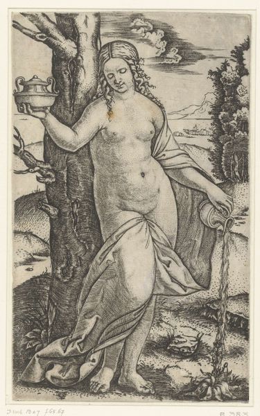Editor: This engraving, “Venus als Lust,” made around 1600 by Wierix and currently housed in the Rijksmuseum, has a remarkable textural quality despite being an engraving. What’s interesting is seeing not just Venus herself, but this whole bustling landscape of laborers surrounding her. How does the work's material form and process of creation intersect with its subject matter? Curator: Exactly! Forget about the classical mythology for a moment. Look at the lines etched into the copper plate; each one is a physical act, a mark of labor. Wierix was a master engraver, part of a thriving printmaking industry in Antwerp. This wasn’t about individual artistic genius, but skilled craftsmanship reproduced for a market. Consider the societal conditions; the work was made as commodity to meet demands. The figures in the background, blacksmiths, anglers, builders...they're all engaged in productive activities. Does the image create any direct relationship between their labor and Venus’s allure? Editor: I see what you mean. It’s like Wierix is connecting Venus – traditionally a symbol of leisure and beauty – with the world of work, suggesting her desirability fuels industriousness. It’s printed with lines, and we see lines in every task in the background! But doesn’t that almost *elevate* those labors? Is that the artist's intent? Curator: Perhaps not "elevate" in a moral sense, but certainly acknowledge. This era of art and production shows these as interrelated elements, rather than opposing forces. This work is more interesting as artifact of that cultural exchange than as any idealized version of history and mythology, Editor: I never considered how the economic conditions of art creation can inform our understanding of the images depicted! It really changes my perspective. Curator: Absolutely. Examining the materials and the labor involved opens up the layers and implications, helping to re-evaluate the visual culture and industry in 17th-century Antwerp.