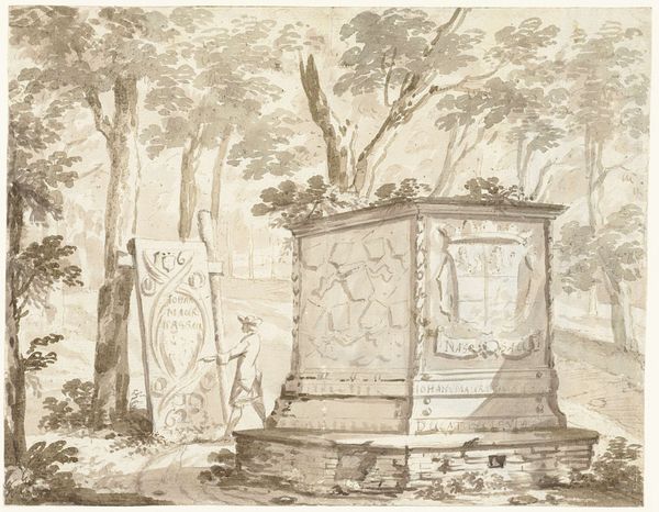This etching, titled "Grafmonumenten voor Klinkhamer, Kreijenburg en Hartz," meaning "Grave Monuments for Klinkhamer, Kreijenburg, and Hartz," was made around 1830 by an anonymous artist. It depicts three memorials in what appears to be a serene, wooded setting. During the early 19th century, memorial art reflected the social values of remembrance and the commemoration of prominent individuals. These monuments weren't just about marking a death; they were also about celebrating a life, and underscoring social hierarchies through commemorative visibility. Each monument is inscribed with biographical details, suggesting the importance of recording and preserving one’s legacy. The uniformity in the style of the monuments speaks to a formalized approach to mourning and public memory. Yet, we can also consider the emotional weight of these memorials. They act as a focal point for grief and remembrance for the families and communities connected to these individuals. This etching reminds us that even in the most formal and public displays of remembrance, there remains an intensely personal and emotional core. It reflects both societal expectations and private emotions.