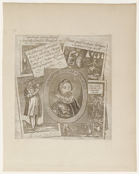Editor: Here we have Adrien Aubry's "Portret van Petrus Borel omringd door scènes uit Champavert", an engraving on paper from 1872, currently held at the Rijksmuseum. It's such an intricate and dark piece. What do you make of this complex portrait? Curator: Well, the very construction screams its context. Look at the deliberate arrangement of Borel amidst scenes from his own Champavert novels. It speaks volumes about the burgeoning Romantic ego and the market's demand for artist-as-celebrity. Consider the choice of engraving—a relatively accessible medium—as an indication of its purpose of broader circulation, almost like early fan merchandise. What social strata do you imagine was consuming these images? Editor: Maybe an educated middle class with a taste for literary and artistic gossip? The way the artist weaves in visual references, from the skull to the dramatic narrative scenes, seems designed to appeal to a sophisticated audience. Curator: Precisely! Aubry isn’t simply representing Borel; he's curating his persona for public consumption. He's packaging him as a brooding, Romantic figure – almost a Byronic hero for the French masses. Note how the scenes hint at the violent and passionate stories for which Borel was famous. This blend of biography and fiction was strategically employed to craft a public image and boost his market presence. Editor: So the portrait is not just an image, but also part of a larger commercial and cultural phenomenon. It's fascinating how artistic identity can be carefully manufactured and consumed! Curator: Indeed. Understanding art means understanding the complex dance between artist, artwork, audience, and the forces shaping their interaction. This piece highlights that beautifully. Editor: I'll definitely look at these portraits with new eyes from now on. Thanks!