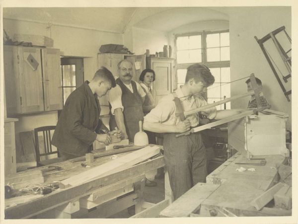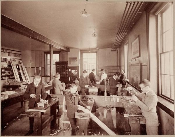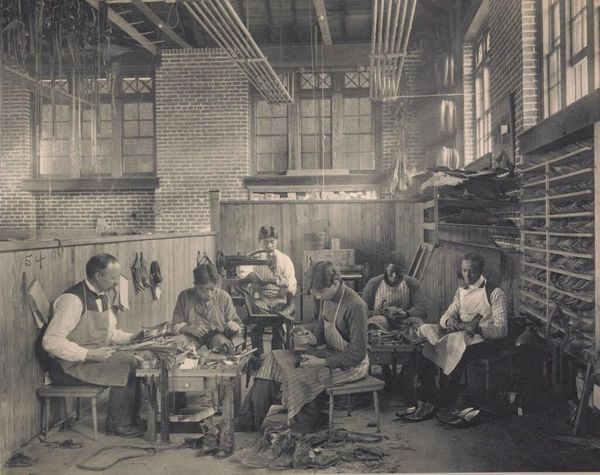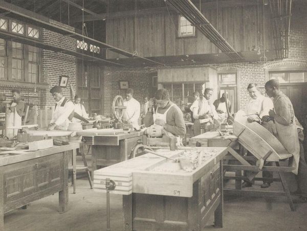 Editor: We're looking at "Werknemers rond een werkbank in een fabriek," a photograph, probably taken between 1900 and 1945, maybe by Frank Meadow Sutcliffe. It depicts workers in a factory. The light seems very diffused. I'm struck by the textures - wood, metal, and clothing - and the sheer repetition of bodies and labor. What do you see here? Curator: I see a careful composition meant to document, but also perhaps elevate, the process of industrial production. Look at how Sutcliffe uses the gelatin-silver print – a relatively new technology at the time – to render the details of labor. It highlights the materials being manipulated by these workers, making their presence as important as the labor itself. Editor: So, it's not just about documenting their work, but almost glorifying the process and their contribution? Curator: Precisely! Consider the social context: rapid industrialization. Photography was uniquely positioned to capture and circulate images of this new world of labor. Do you notice anything about their clothing, perhaps suggesting a separation from traditional crafts? Editor: Yes, many of the men are wearing very similar caps, perhaps denoting rank, station, and function rather than craft. They’re almost like components within the larger machinery of production. Curator: Indeed. And consider the machinery itself – its materiality, its presence dominating the room. The photograph challenges any romantic notion of craftsmanship, instead presenting labor as a system, made of individuals, materials and processes all working together in an age of increased consumerism. What do you think? Editor: I didn't consider the photograph a document challenging Romantic notions. So it reveals the means and materials of production itself, in terms of its cultural time and historical background. Fascinating. Thank you. Curator: My pleasure. This work truly shows that art is entrenched in the material processes of everyday life.