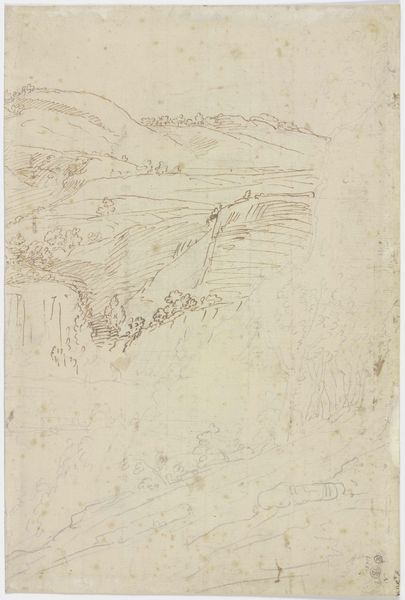 Curator: Before us is "Le Pêcheur sur le Pont," or "The Fisherman on the Bridge," by Rodolphe Bresdin, crafted sometime between 1839 and 1885. It's a striking example of his etching technique, resulting in an almost otherworldly landscape. Editor: My first impression is one of intricacy, yet also of isolation. The delicate lines create this sense of dense detail, but the limited color palette evokes a certain somber mood. Curator: Absolutely. Bresdin’s work is often described as hallucinatory, filled with dense symbolism. The lone fisherman, a recurring figure, is an archetypal image—one may say it represents man pitted against the sublime and indifferent forces of nature. The bridge is more implied, more a mental passage than a tangible place. Editor: And that bridge visually ties the composition together; the flow of water seems to echo the leaning tree, almost mirrored in its arc. The texture achieved with such sparse materials is compelling; it nearly vibrates on the paper! Curator: Look closer, and the symbolism intensifies. The foliage appears not just as decoration but teeming with implied figures and fantastical creatures that speak to dreams, anxieties, or even collective fears related to modern, ever-changing realities of that period. Editor: The relationship between positive and negative space, the stark contrast—it draws my eye in to search for definition within the complex interplay of lines and shade. This all results in a unique and subtly anxious rhythm. Curator: It's as if Bresdin offers a modern allegory. The fisherman becomes everyman: insignificant against an awesome, unknowable nature but inextricably linked. This connects directly to shifting societal roles throughout 19th-century France. Editor: I am captivated by Bresdin’s visual language—the density of details. A close look teaches so much about visual thinking and compositional mastery. It gives the etching strength to communicate beyond any story. Curator: Yes, despite the overwhelming landscape—the cultural symbols it carries—at its core, the picture creates an enduring symbolic bridge to those themes for present day viewing audiences, Editor: A very apt metaphor to sum it up!