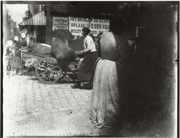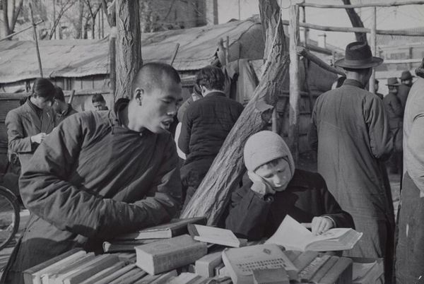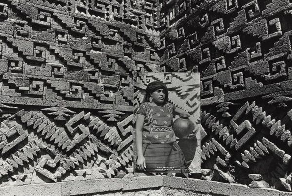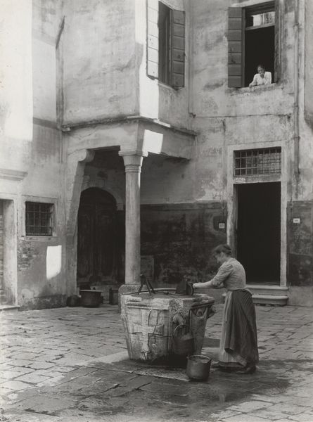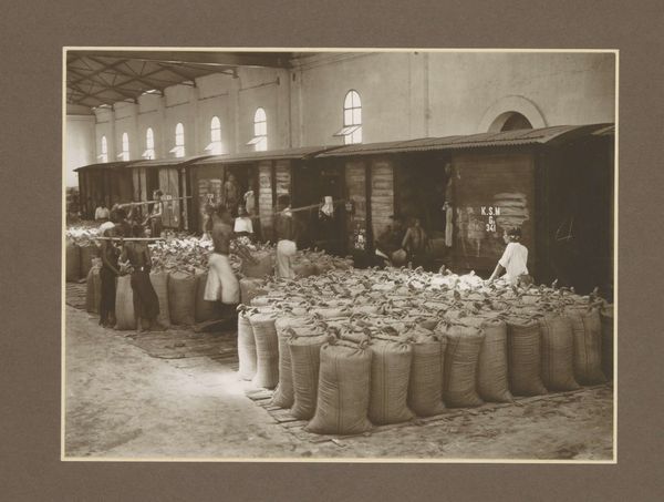 Curator: This black and white photograph is "Bok Choy Vendor, Beijing, China," captured by Henri Cartier-Bresson in 1948. There’s a quiet energy here, wouldn’t you say? Editor: Absolutely. The weight of all that produce really grounds the composition. All I can think about is the manual labor involved – growing it, hauling it, arranging it all. You can practically smell the earth. Curator: Indeed. Bresson had an incredible knack for finding beauty in the everyday. Look at the layers here – the vendor in the doorway almost hidden amidst the exquisitely carved wood. It speaks to how daily commerce unfolds even within such historically-rich structures. Editor: Those architectural details are astounding. So much handcraft, so much skill poured into the building itself—a stark contrast to the rough, elemental quality of the vegetables on the ground. I imagine each vegetable was individually inspected and carefully positioned; how is such a laborious act economically sustainable? Curator: I think this photograph works because it finds harmony in those contrasts. Bresson, more than just a recorder, captured the poetry embedded in ordinary moments during his time in China. He brings a certain respect. Do you feel it, too? Editor: Respect? I sense the grit. Look how the piles of bok choy dominate the foreground. It throws everything out of balance in a powerful way. How does laboring in the community for such commodities structure Chinese lives during this moment? The question makes the photo for me. Curator: Well, perhaps it’s precisely that sense of labor that imbues it with humanity, right? The mundane elevated. It allows you to engage and consider all of these intricate dynamics, this dialogue, across space and time. Editor: Ultimately, it highlights the paradoxes inherent to daily life; the beauty amidst labor, commerce conducted within ancient structures, an invitation to consider broader perspectives that's hard to dismiss. Thank you for bringing those to my awareness.